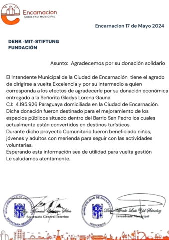 Lorena Gladys Gauna und der Künstler Ruben Sykora haben mit Kindern in einem ärmeren Stadtteil von Encarnacion in Paraguay, Fußwege mit Mosaik gestaltet, um die Wertschätzung und Identifikation mit Ihrer Heimat und Herkunft zu festigen. Die Kinder bekamen somit eine sinnvolle Beschäftigungsalternative und entwickelten handwerkliche Fähigkeiten und Solidarität untereinander.